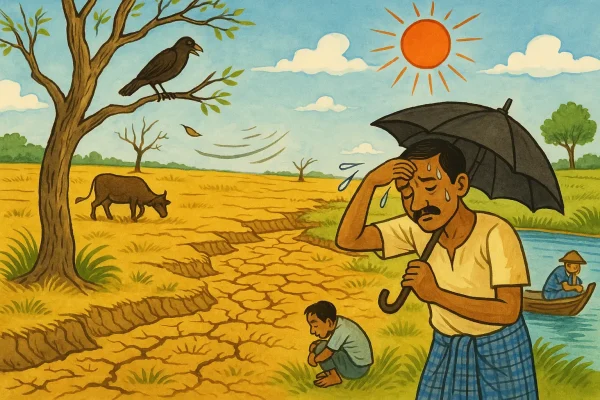 ফজলুর রহমান ঘাম ঝরেদরদরগ্রীষ্মের দুপুরেখাল বিলচৌচির,জল নেই পুকুরে।মাঠে ঘাটেলোক নেই,খাঁ খাঁ করে রোদ্দুর!পিপাসায়পথিকেরছাতি কাঁপে দুদ্দুর।রোদ যেননয়, শুধুগনগনে ফুলকি।আগুনেরঘোড়া যেনছুটে চলে দুলকি।ঝাঁঝ মাখাহাওয়া এসেডালে দেয় ঝাপটা!পাতা নড়েফুল পড়েবাপরে কি দাপটা! বিল ধারেচিল বসে’ঘন ঘন ডাকে রে।মাঝি বসে ঢুল খায়খেয়াঘাট বাঁকে রে!