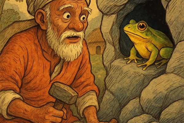 পাথর কুঁদেই দিন কাটত সেই বুড়োর। একদিন পাথর নিতে গিয়ে বুড়ো দেখে পাথরের একটা ফোকরের মধ্যে ড্যাবড্যাবিয়ে তাকিয়ে আছে একটি সোনাব্যাঙ। ব্যাঙটার রঙ যেমন সোনালি সবুজ, ঠিক তেমনি তরতাজা সেই ব্যাঙটা।ব্যাঙটাকে দেখেই বুড়োর বুকে উথাল-পাতাল করে উঠল পরিবর্তনের ঢেউ। বুড়ো ভাবে, শুকনো খটখটে এই নীরস পাথরের মধ্যে থেকেও ব্যাঙটা কেমন হৃষ্টপুষ্ট হয়ে উঠেছে। এই পাথরের…